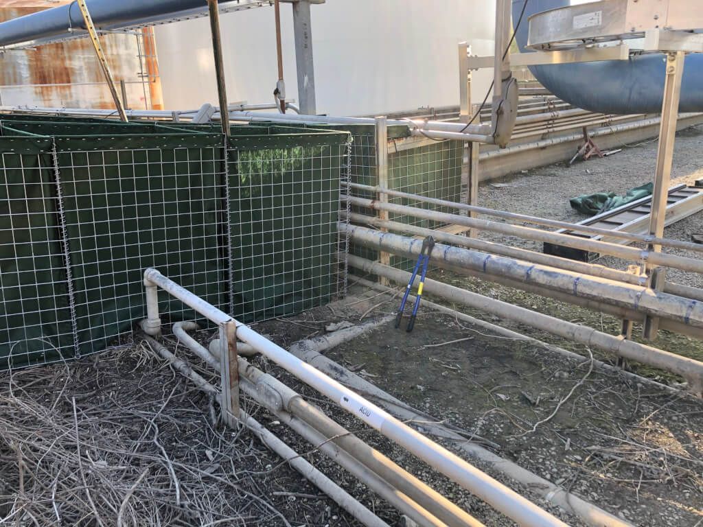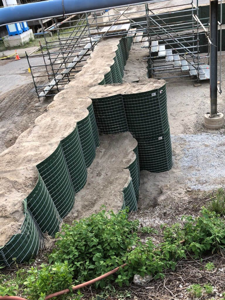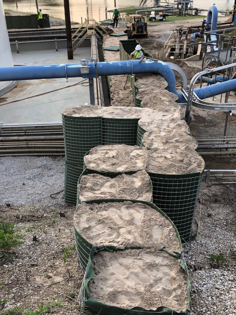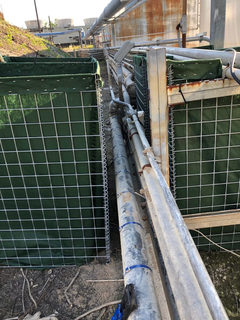 HESCO provides flood protection for Oil and Gas facilities in Louisiana and this is a site that required a versatile flood barrier capable of allowing existing pipework to transition through it while also tying the barrier into and a sloped embankment. Additionally, this project needed to be 8’ tall and capable of being left in place for a number of years without significant maintenance requirements.