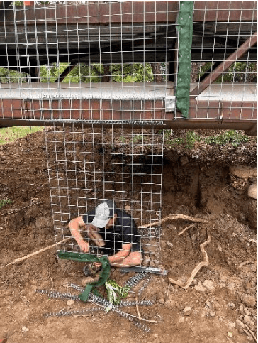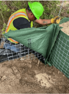 NOTE: Some staples within the geotextile needed to be pulled out during this process to allow the face panels to move inward. The geotextile was not cut during this process. We did go back and cut out the extra 6” of wire mesh that can be seen protruding