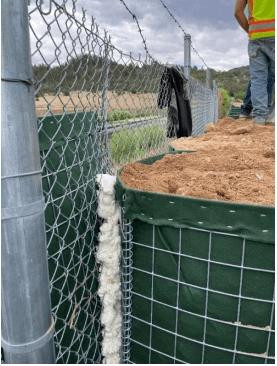 Normally, we always make sure to join the HESCO flood barriers at the coils with the pins provided. Sometimes, there are obstructions that prevent the HESCO from being joined properly. In this case, there was a fence that the property owner did not want to cut so we worked around it. You can see how we butted the HESCO flood barriers as close together as we could on either side of the obstruction (a fence) and proceeded to fill the HESCO cells on either side. During the filling process, the end panel of the HESCO expanded slightly which reduced the amount of space that water can pass through. We then used spray foam to seal this gap. Spray foam is extremely effective at closing gaps or sealing points of potential seepage within a flood wall and a fantastic tool to have on hand!