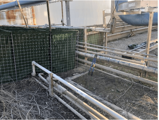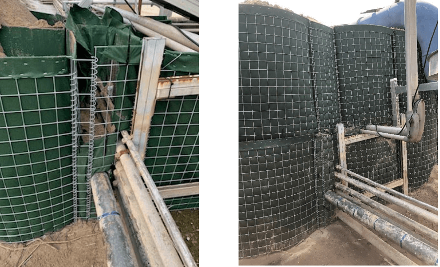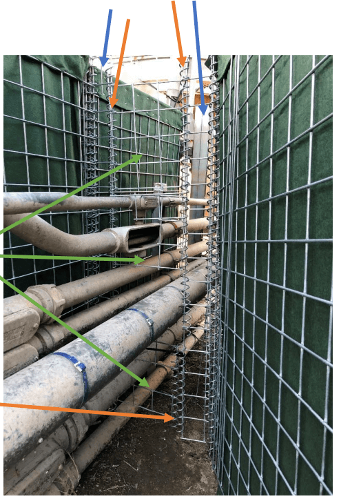 A) We cut two strips of a single square strip of the welded wire mesh and attached it vertically to the HESCO Bastion units on either side of the pipes as shown