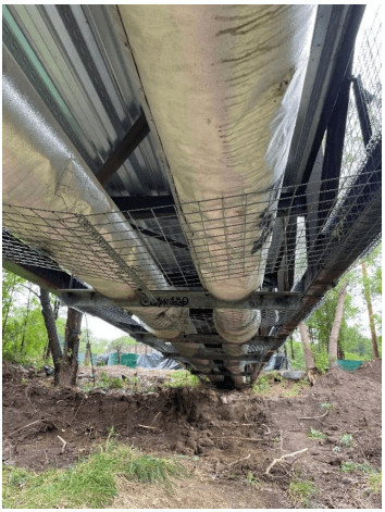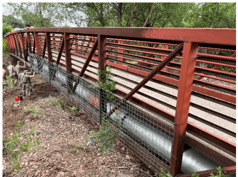 This is one of our most unique, non-traditional applications of this product during a flood event and is a great testament of how this product can be taken apart and reassembled to creatively solve challenging problems.In this case, there was a sewer pipe below a pedestrian bridge that had been damaged from floodwater and debris impact in the past. With monsoons coming and a very real threat of imminent flooding, it was important to devise a way to protect this sewer pipe from damaging debris impacts during a flood event from both the side and below. To solve this problem, the HESCO was completely taken apart and clad to the side of the bridge, securing it with zip ties, tie wire, and parachute chord. To protect the pipe from below, we were able to wrap/screw sections of wire mesh around the steel beams on either side at the bottom of the bridge as an anchor for additional wire panels to span below the bridge. This was designed to mitigate against floating debris from going under the bridge and somehow damaging the pipe by getting stuck or wedged against the pipe during a flood event.