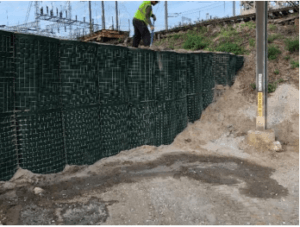 This an example of how you can modify a HESCO flood barrier to make it thinner. In this case, we were installing flood barriers at the Las Vegas water treatment facility and found that the HESCO was 6” thicker than the base it was supposed to sit on. The solution was to unscrew the helical coils on one side of the entire stretch where the barrier did not fit, move the face panels inward by 6”, and re-screw the helical coils back into place such that the thickness of the barrier was 6” thinner.