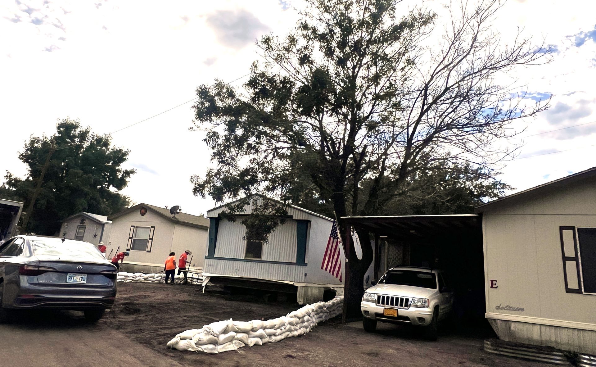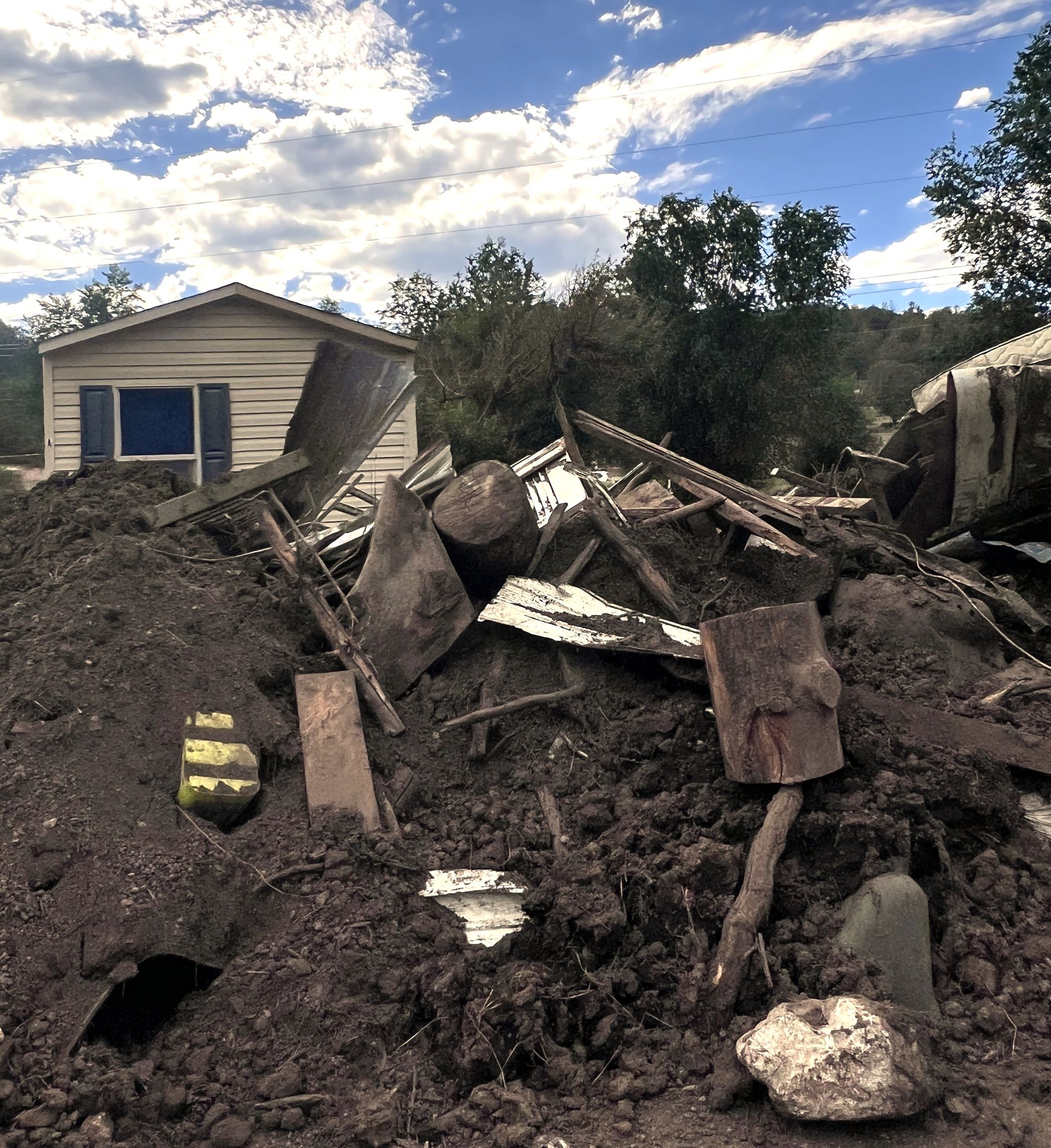 Ruidoso looks like a surreal war zone suffering from, and preparing for, continued disaster events like flooding. Sandbags fortify homes and businesses everywhere while uniformed military personnel from the National Guard drive the streets delivering sandbags performing a variety of support functions to defend against the new threat of flooding. The surrounding forest is black from the cooked ground to the burnt trees that look like nothing more than blackened poles sticking out of the ground and devoid of any sort of greenery. Mountains of rock and debris have cascaded down the mountain sides from recent flooding and have created debris piles that are everywhere. This is accompanied by fields of black soot and mud that cover the landscape, the roads, yards, and even the insides of homes from the first rain and subsequent flooding since the fire began. The town then flooded again about 6 days later and again about 3 days after that!